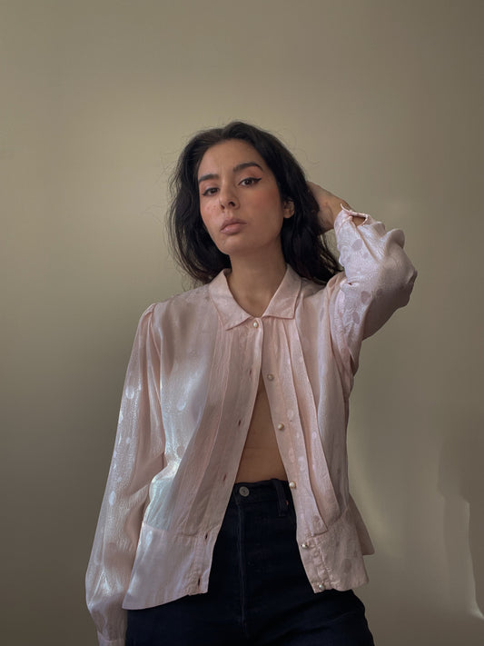 Vintage Pink Silk Top With Frontal Pleating And Sweet Button Details.