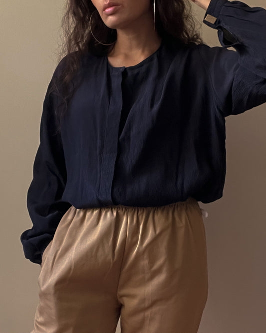 Vintage Designer Giorgio Armani Crinkle Silk Blouse w/ Cufflink Sleeves