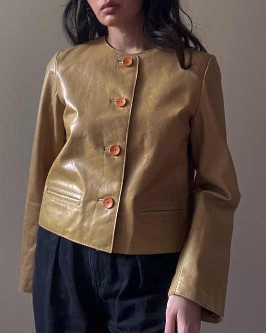 Vintage Designer Nine West Tan Leather Collarless Cropped Jacket