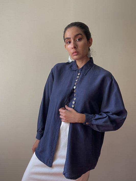Vintage Navy Silk Blouse With Texturized Buttons