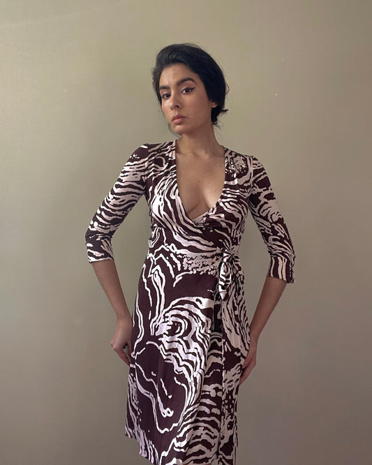 Vintage Designer Diane Von Fürstenberg Chocolate Brown Print Silk Wrap Dress