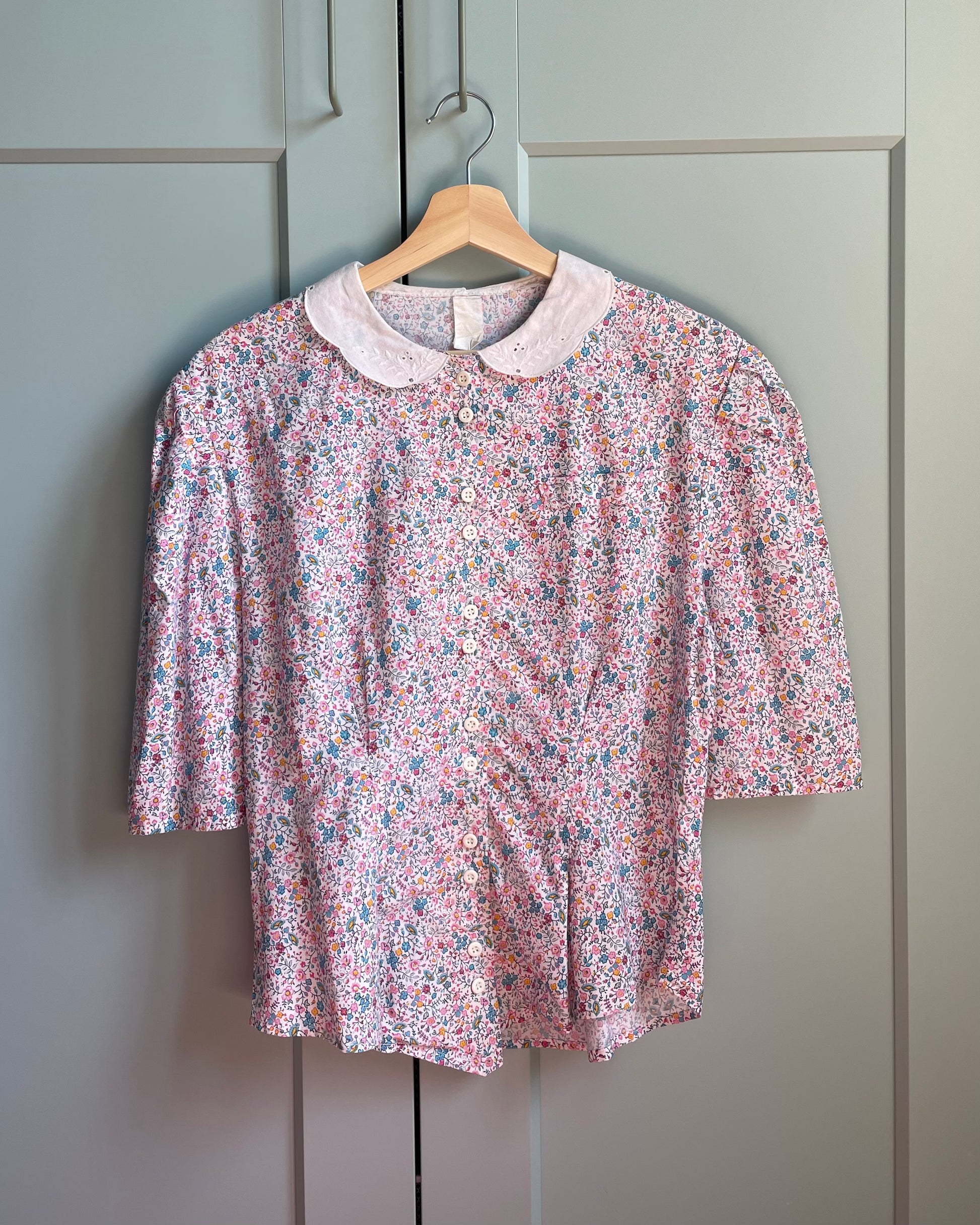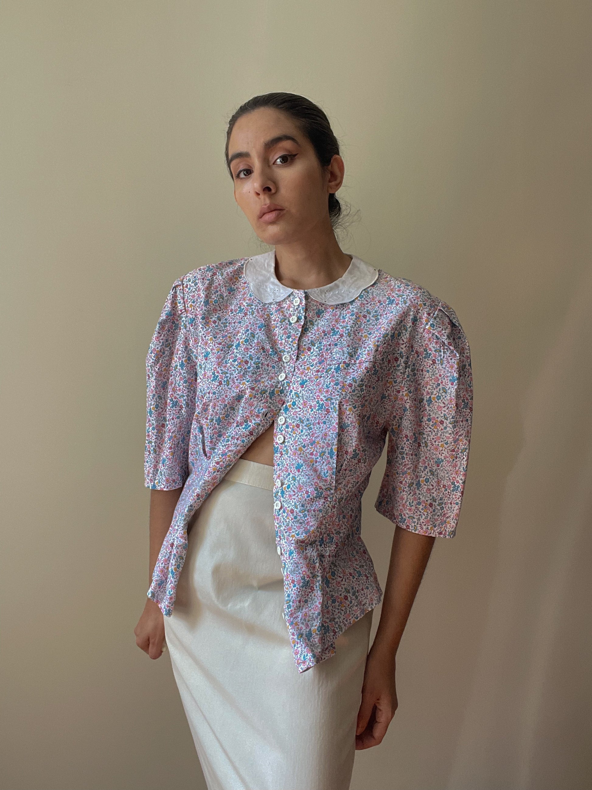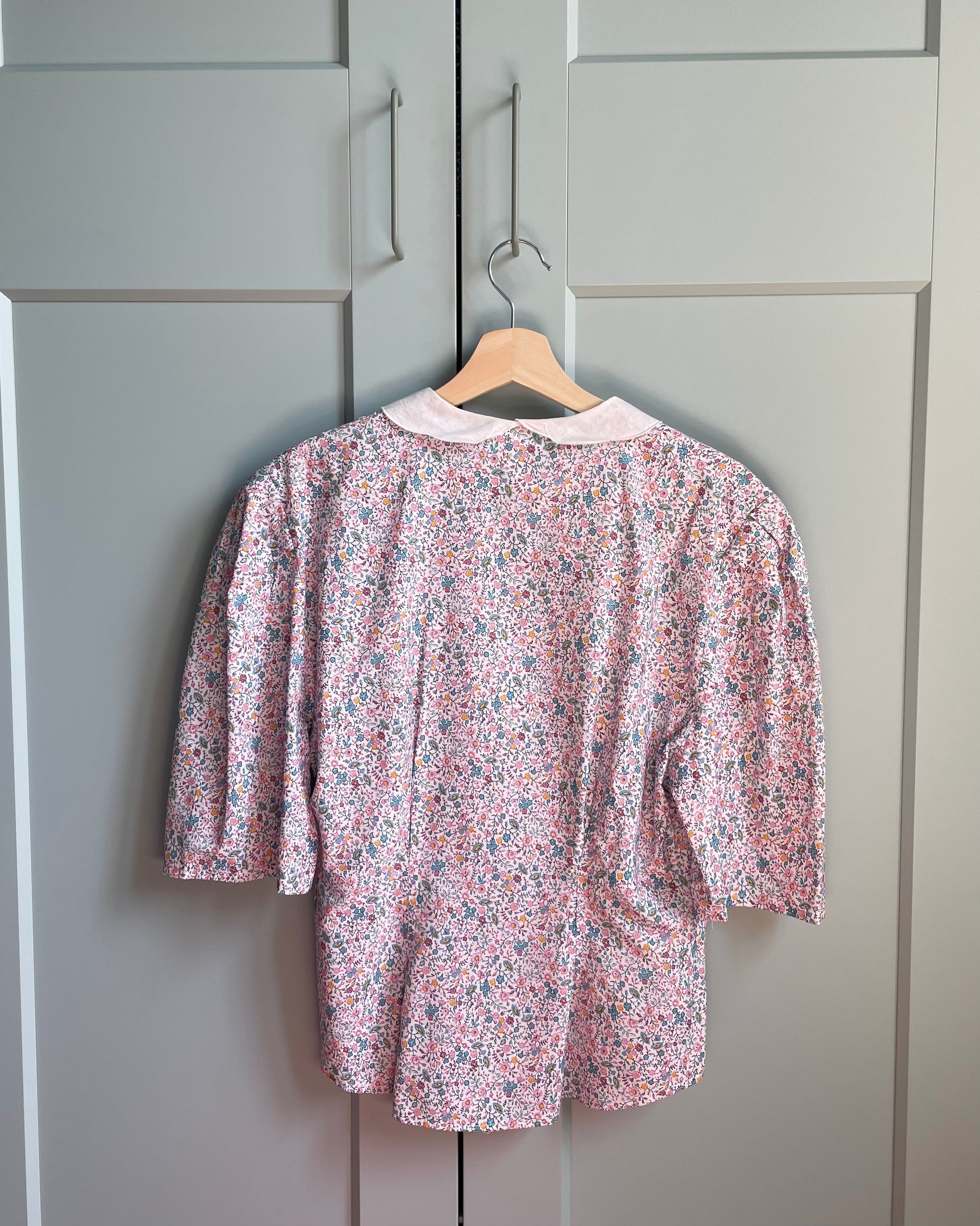 Embroidered white collar with mini floral pattern. Puffed sleeve. Double button layout. Peplum silhouette. Mock pocket detail.Very Good Condition.