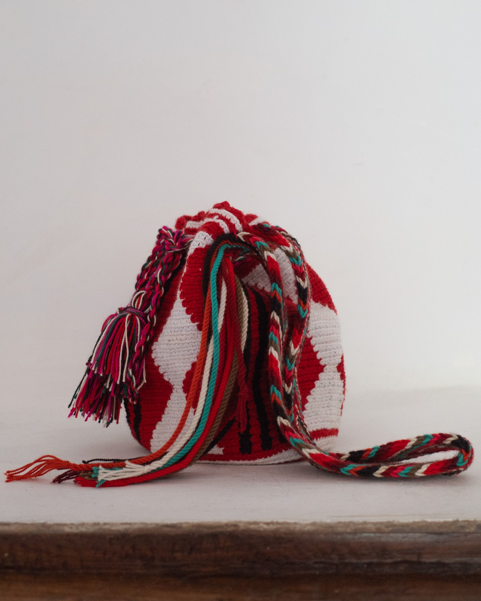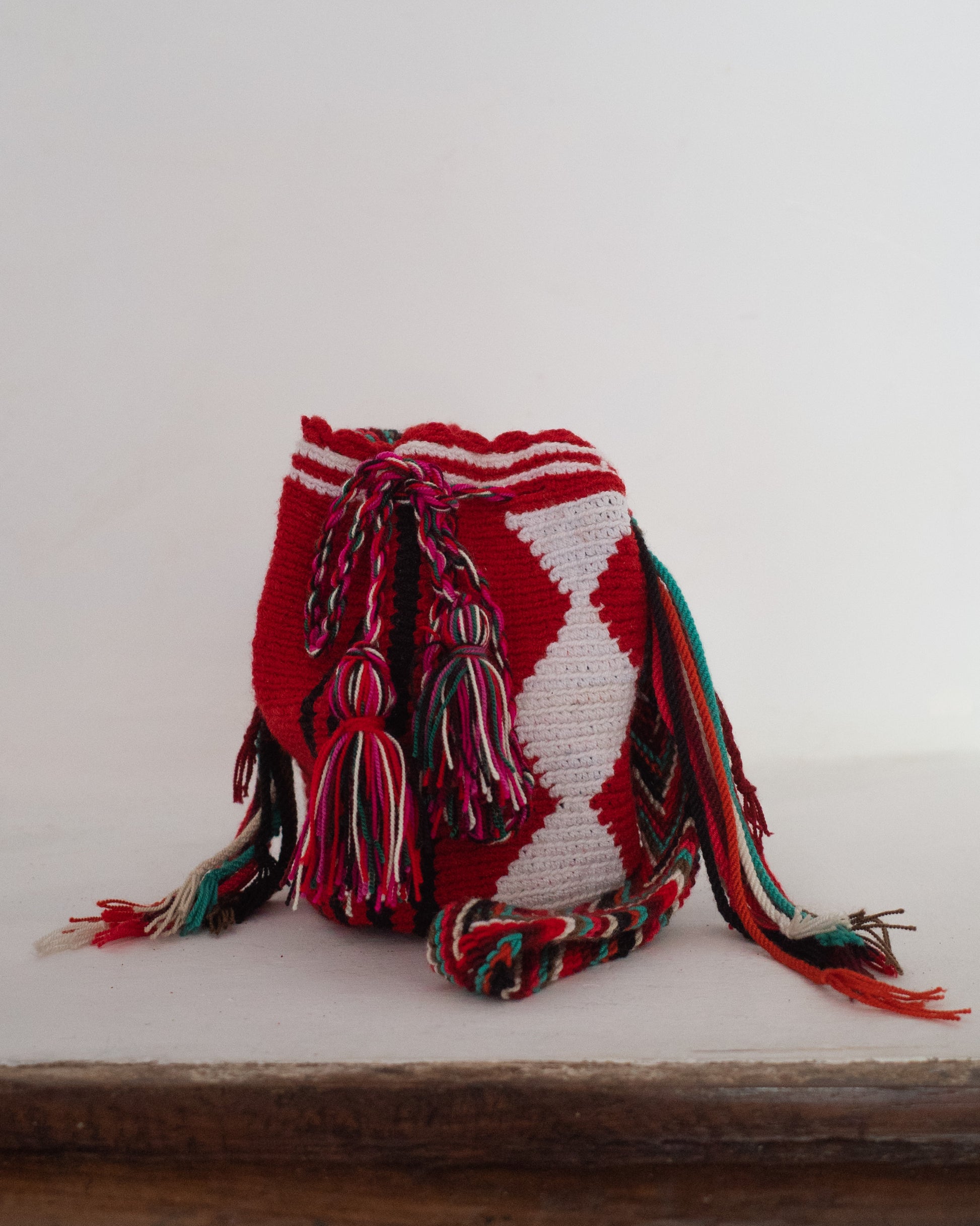This mini bucket bag is constructed in Colombia with colorful threads made of Cotton and Aloe. The braided shoulder strap can be easily adjusted by tying a knot to shorten. Drawstring Closure with Fringed Pom Poms. Excellent Condition.