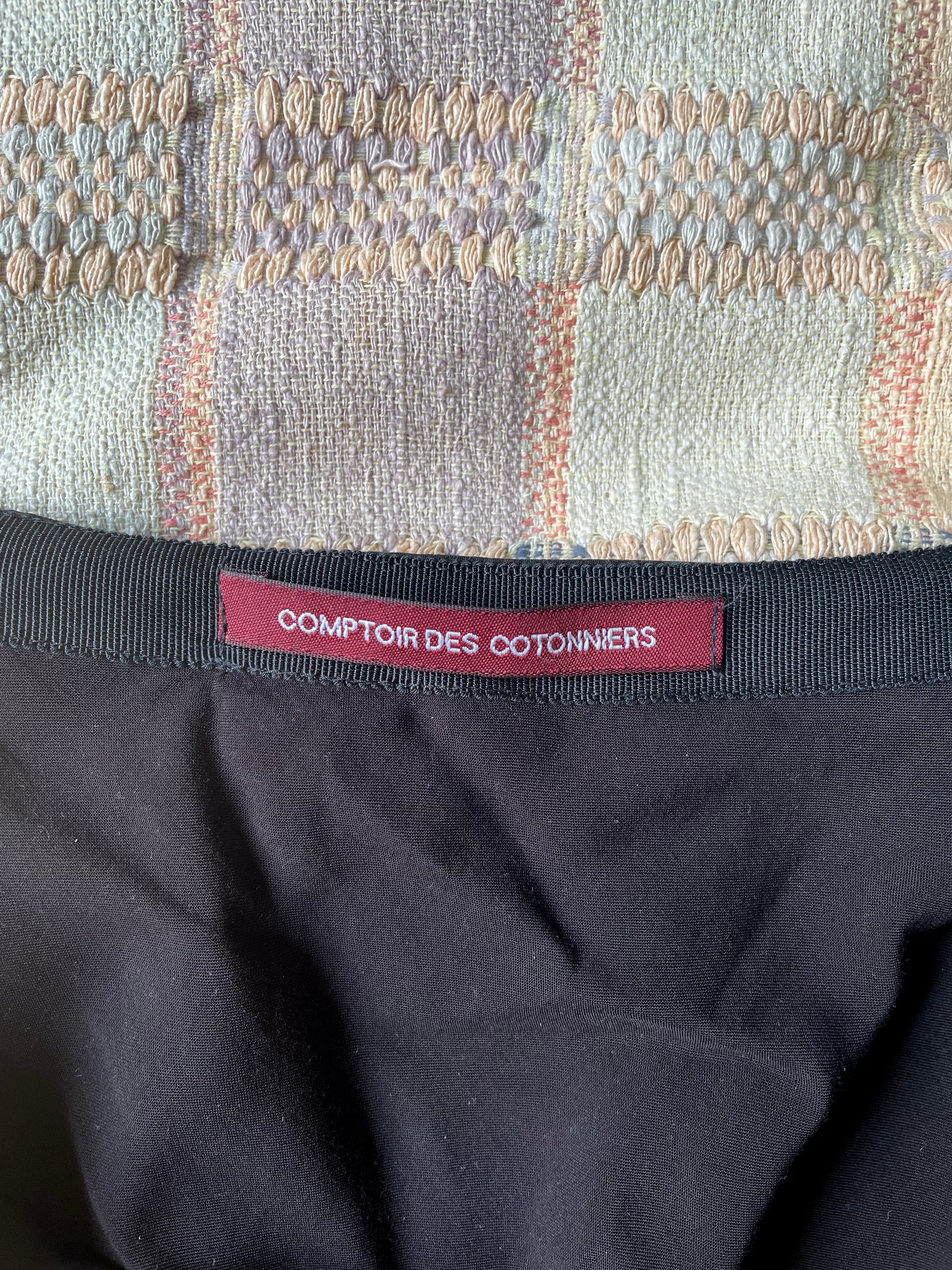 Classic Wardrobe Staple. Vintage Comptoir des Cotonniers in Black Silk Bias Cut skirt. A bias cut is a woven fabric cut on the diagonal in the patternmaking process. It is most preferred as it has a slight stretch feel and a beautiful draping on the body, accentuating the most feminine parts of the body. Zip Closure on the side. Very Good Condition. Original Tagged Size 36. Model Is 160cm (5”3) And Generally Fits XS/S.
