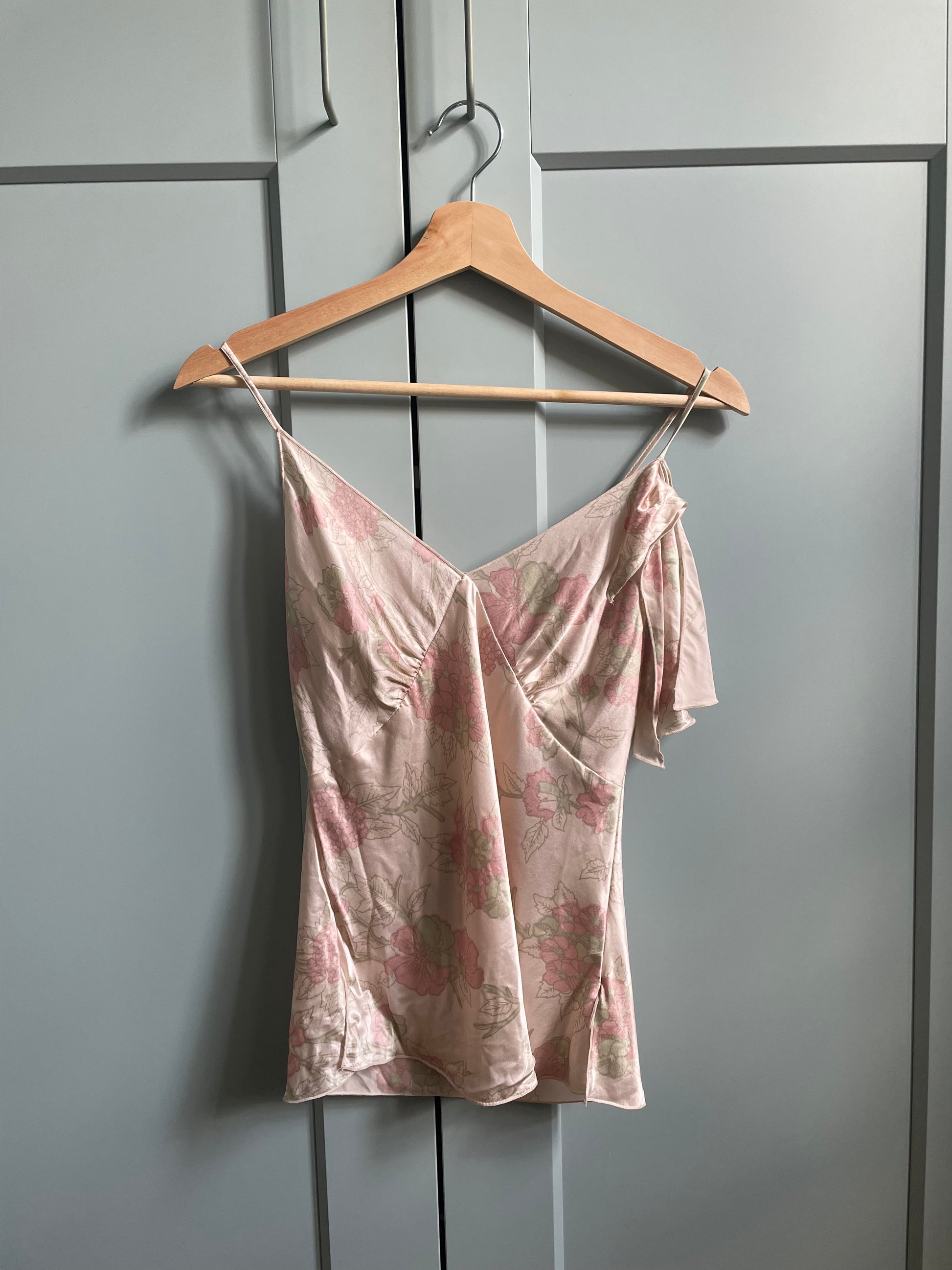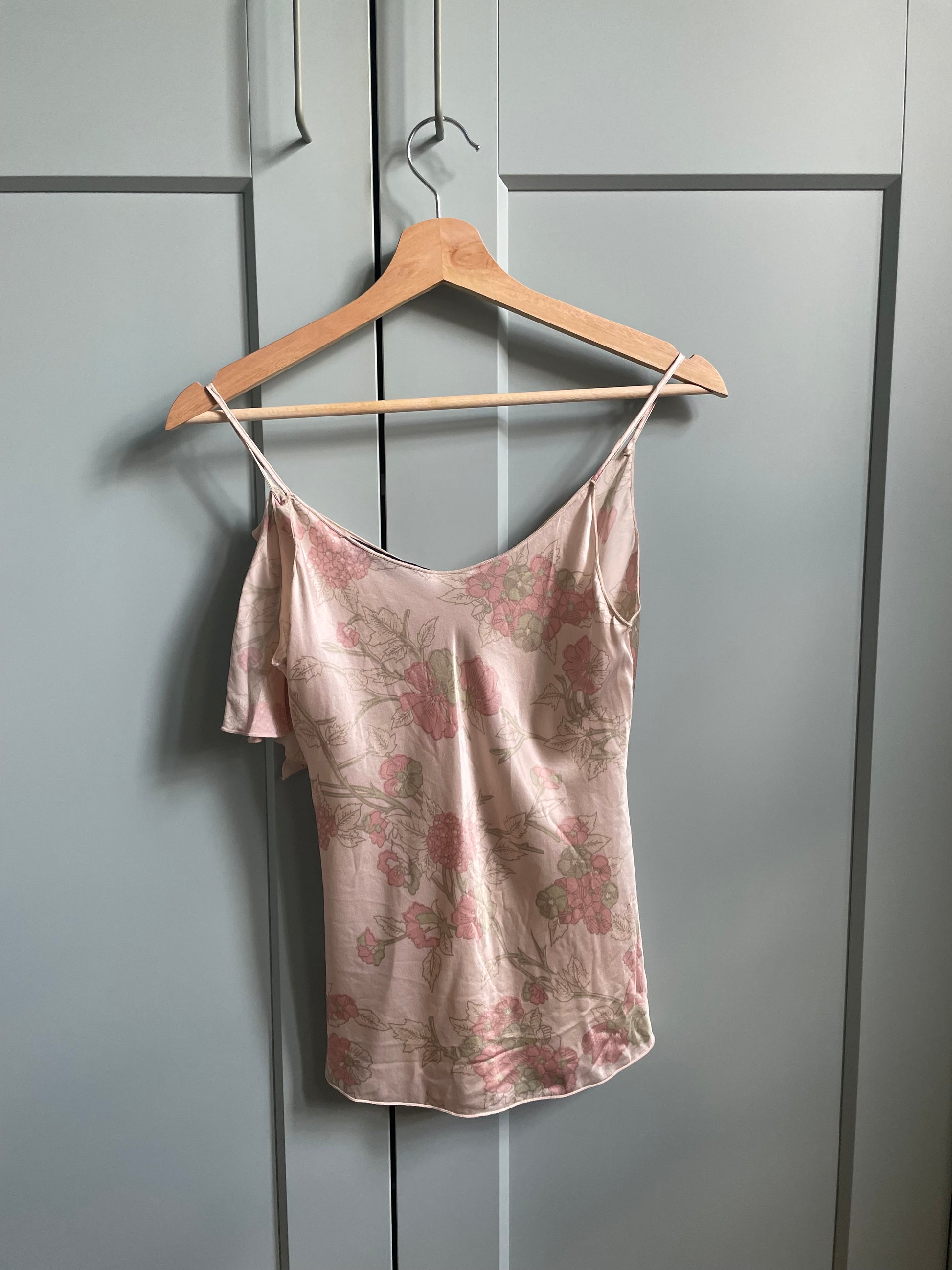 Dreamy Vintage Ungaro Silk Satin Camisole Tank with Feminine Ruffle Detail. Romantic Floral Print. Side Slits for Flowy Drape. Original Tagged size 36, Model Is 160cm (5”3) And Generally Fits XS/S. Very good condition. 100% Silk