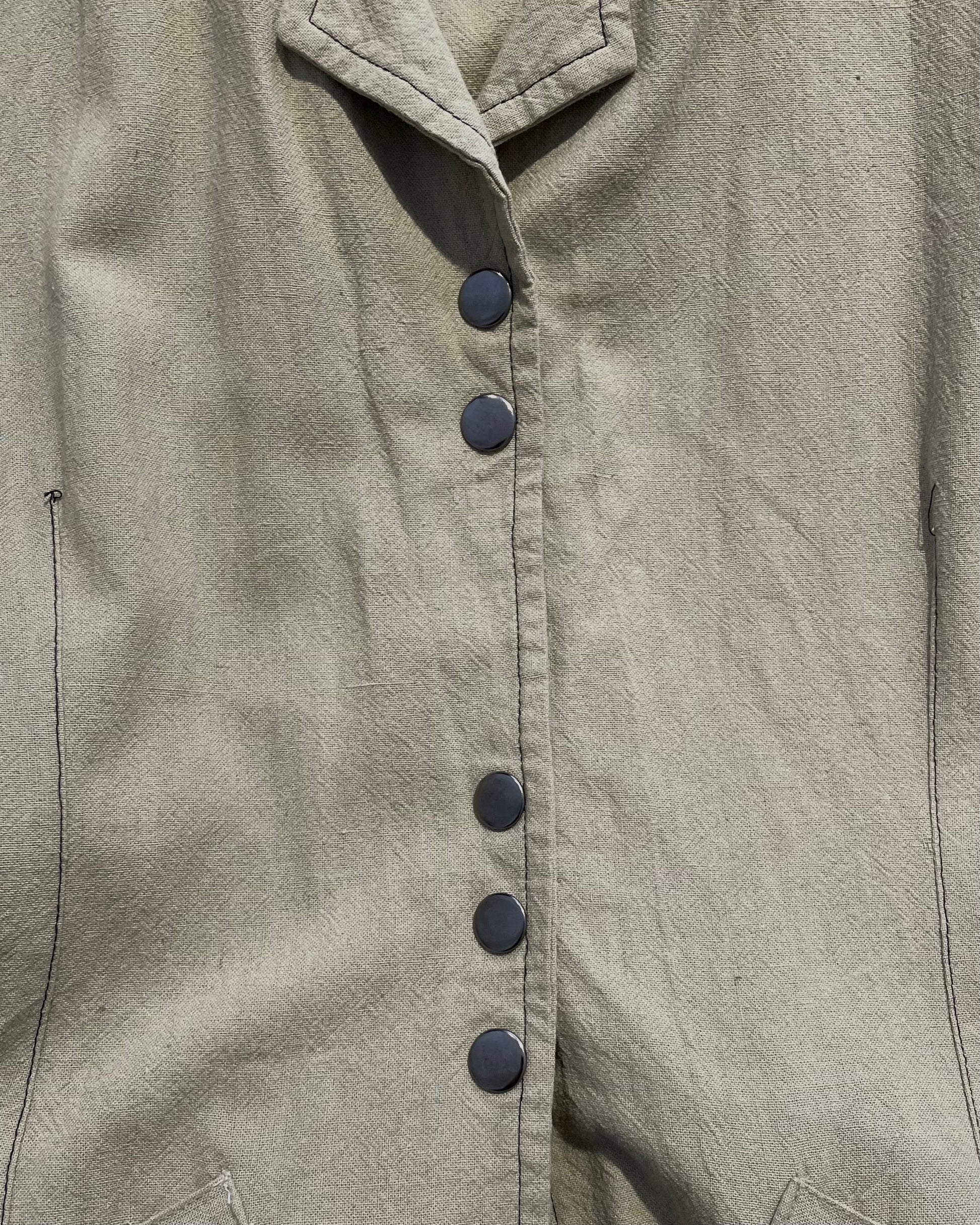 Vintage Bakao Finnish linen top with special details including a metal snap button closure, corseted sleeves, waist cutouts and a minimal abstract print. Best paired with a bootcut jean or wide leg pant. Excellent Condition. Side Pockets. Black Stitching. Taupe Color Excellent Condition. Original Tagged Size 36/38. Model is 160cm (5”3) and generally fits S/M.