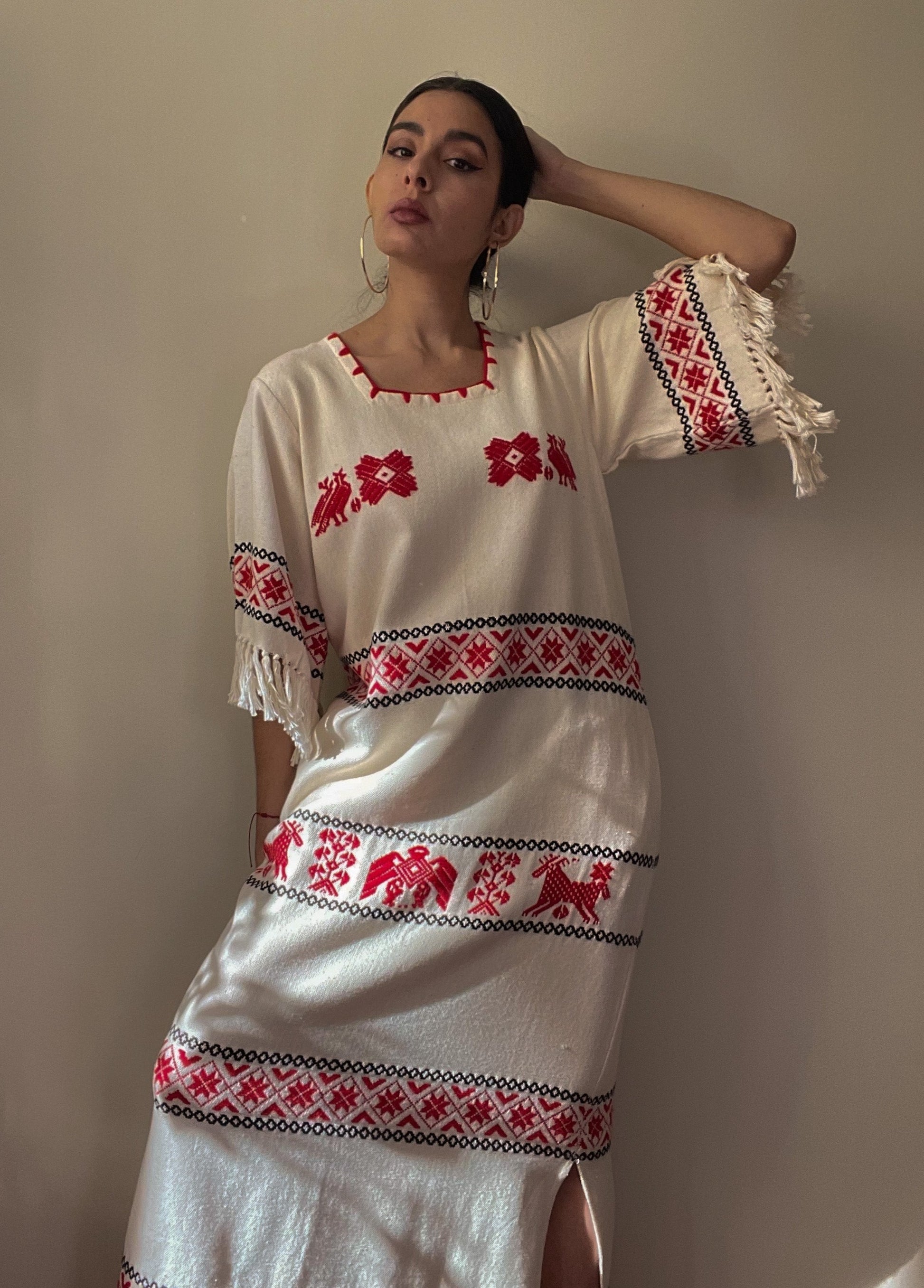 Vintage Mexican Boho Dress With Red/Black Embroidered Details And Fringe Sleeves And Hem. 2 Hip Pockets