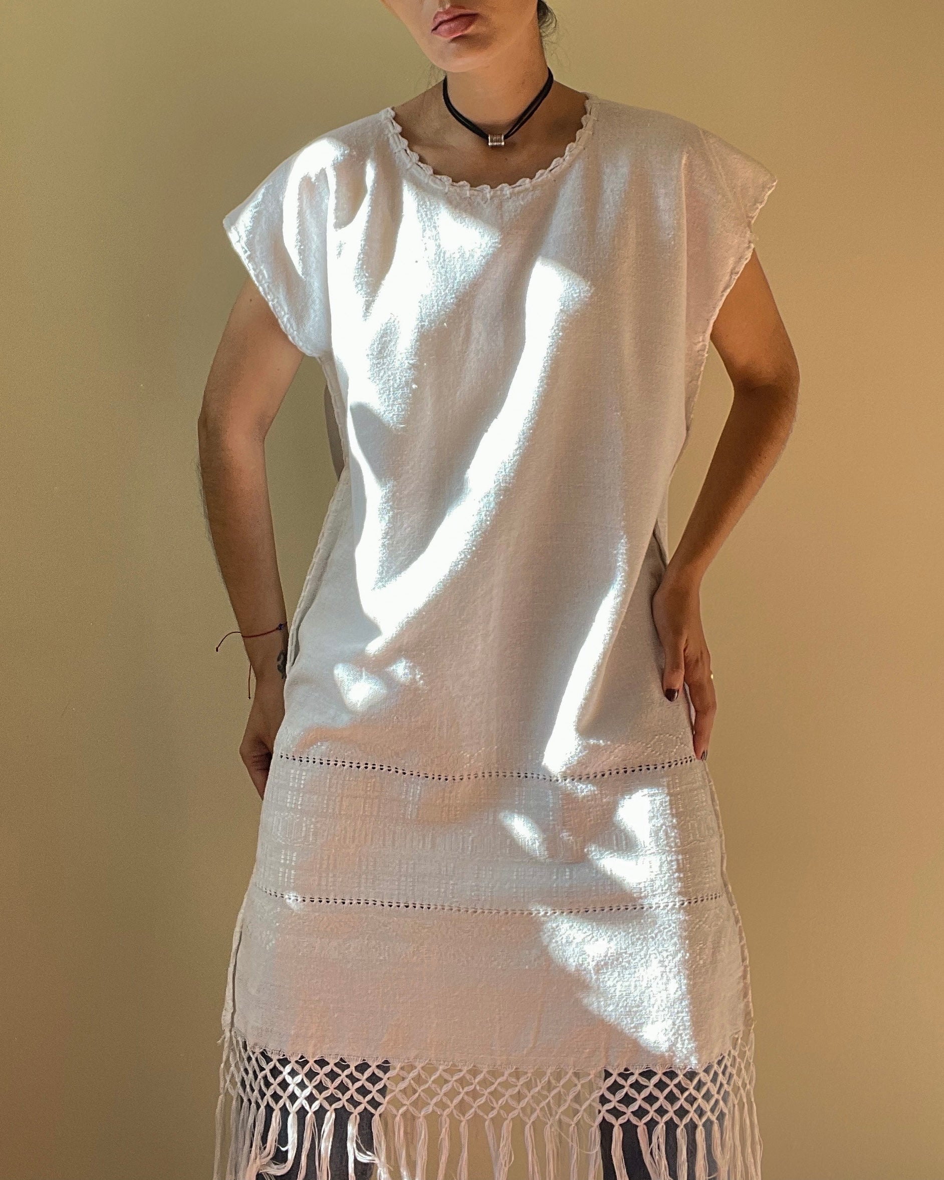 Perfect for Midsummer. Ditch the ordinary, embrace the preloved. Preloved Mexican Caftan Dress featuring an embroidered detail with fun fringe hem. Loose Fit, Cap Sleeve. Made in Mexico.